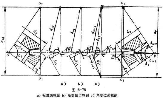 1=-x2≠0,x∑=0)和角变位锥齿轮副(图6-78c)。后者又分为:正角变位锥齿轮副(x∑>0)和负角变位锥齿轮副(x∑<0 )。在径向变位锥齿轮副中,由于高变位设计简单,所以多用高变位锥齿轮副。