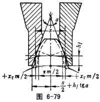 锥齿轮的切向变位用展成法加工锥齿轮时,当产形刀刃之间在分度面上的距离为mx/2时(图6-79),加工出来的锥齿称切向标准锥齿轮,加工出来的锥齿轮称切向变位齿轮,距离变化值称切向变位量x