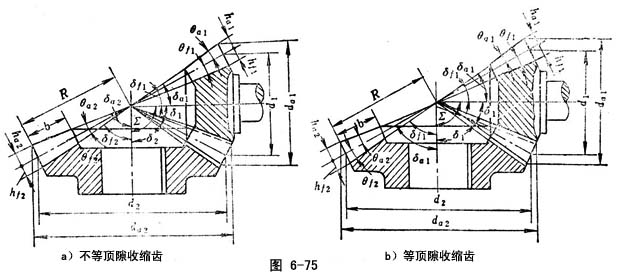 1+δ2,可为90°(图6-74a),亦可为任意角(图6-74b)(∑>90°,∑<90°)。直齿锥齿轮副的主要特点是:齿形简单、设计方便、制造容易、成本低;轴向力小,且不受转向的影响;对安装误差较敏感、易产生偏载;重合度小、工作不平稳、噪声大;承载能力低;传动效率η=97%~99.5%。它仅适用于传动比i12=1~8、速度 υ≤5m/s、功率P≤370kW的低速轻载的场合。但随着鼓形直齿锥齿轮副的应用,直齿锥齿轮副的应用范围将明显扩大,且鼓形直齿锥齿轮副有代替普通直齿锥齿轮副的趋势。