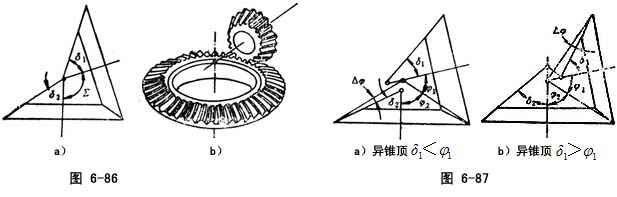 斜交异锥顶外啮合锥齿轮副由两个相配外锥齿轮组成的∑≠90°的相交轴锥齿轮副(图6-87),且两锥齿轮的锥顶不重合。当图中δ