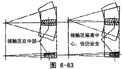 鼓形齿直齿锥齿轮副由两个配对的鼓形齿直齿锥齿轮组成的齿轮副(图6-83)。其特点是:可任意控制接触区,对弥补制造及安装误差有良好效果,可改善齿面应力分布状态,避免齿端部载荷集中,从而提高承载能力,改善传动质量、减少动载荷,降低噪声,传动质量和中小螺旋角的曲线齿锥齿轮副不相上下。它是直齿锥齿轮副的发展趋势。图6-83示出了两种接触状态。