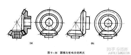 一对安装准确的标准圆锥齿轮齿合时,它们的分度圆锥应相切(分度圆锥与节圆锥重合,分度圆与节重圆重合)其齿合区的画法,与圆柱齿轮类似: