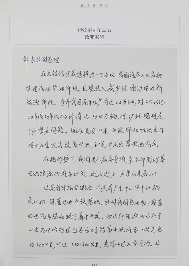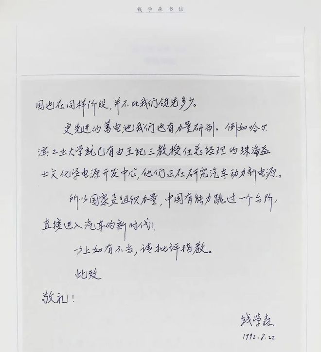 1992年8月22日,钱老给时任国务院副总理写了一封信,在信中钱老提了一个建议,那就是跳过汽油和柴油阶段,直接发展电动汽车。